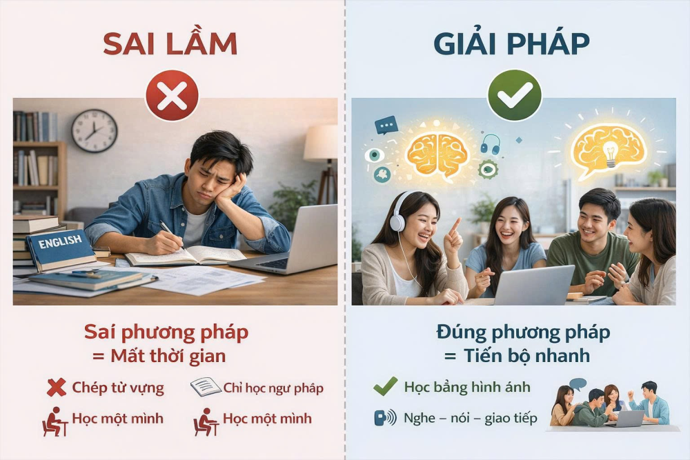 Trong thời đại hội nhập, tiếng Anh đã trở thành chìa khóa để mở ra nhiều cơ hội trong học tập, công việc và cuộc sống. Thế nhưng, nhiều người dù dành ra hàng năm trời để học vẫn không đạt kết quả mong muốn. Lý do chính nằm ở những sai lầm phổ biến mà người học không nhận ra. Việc nhận diện và tránh những sai lầm này sẽ giúp bạn tiết kiệm rất nhiều thời gian và công sức.